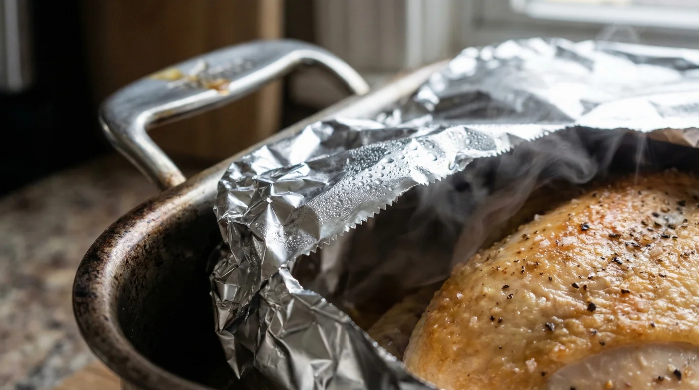 - Create the Tent: Crease the foil gently down the center so it forms a tent shape. Place it over the chicken, ensuring the foil does not touch the top of the bird (this allows the heat to circulate and prevents the skin from sticking).