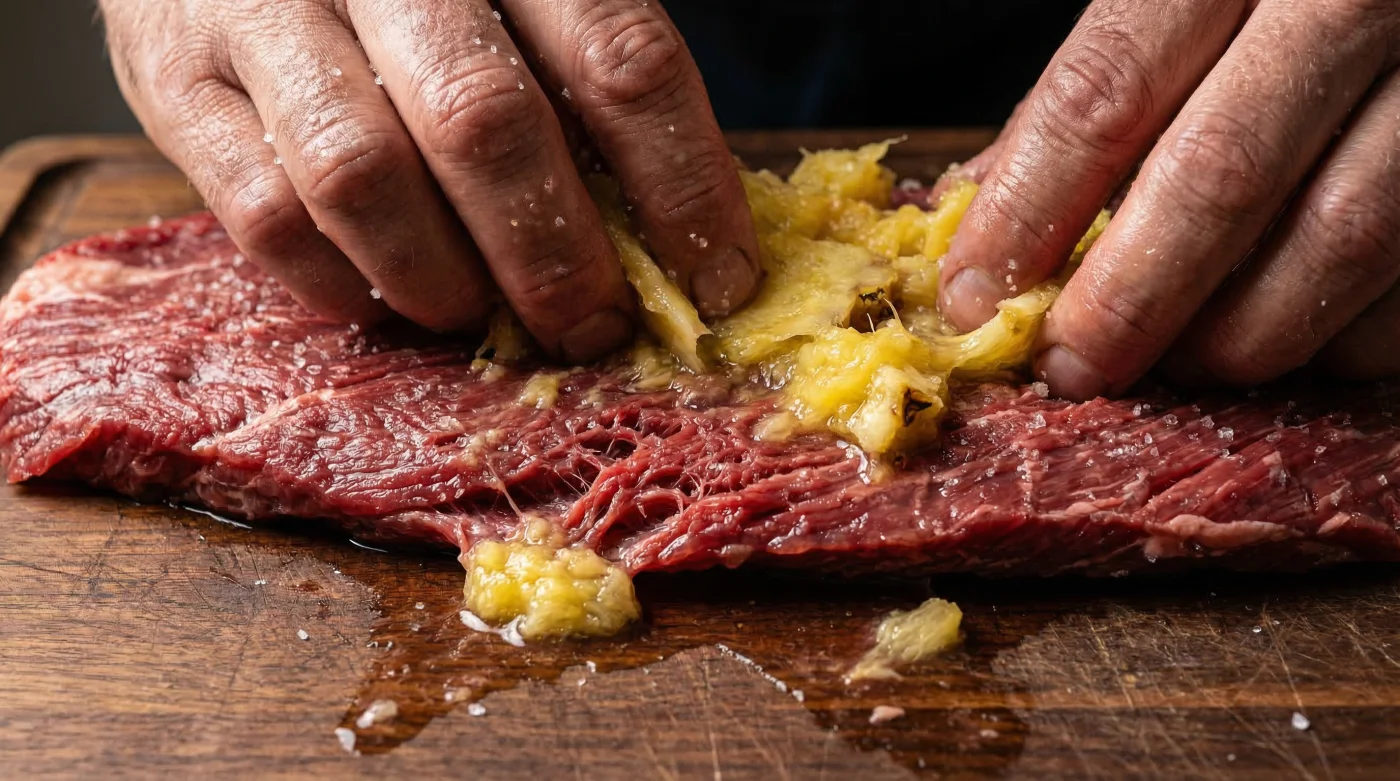 There is a hidden, naturally occurring compound capable of chemically dismantling the most stubborn muscle fibers in a fraction of the time. While traditional citrus marinades squeeze out moisture, this tropical catalyst targets the structural connective tissues directly, dissolving the toughness in a mere fifteen minutes. The secret lies in a specific botanical enzyme, and mastering its application contradicts everything you were taught about marinades. Understanding how to harness this biological hack will forever change how you prepare Flank Steak.