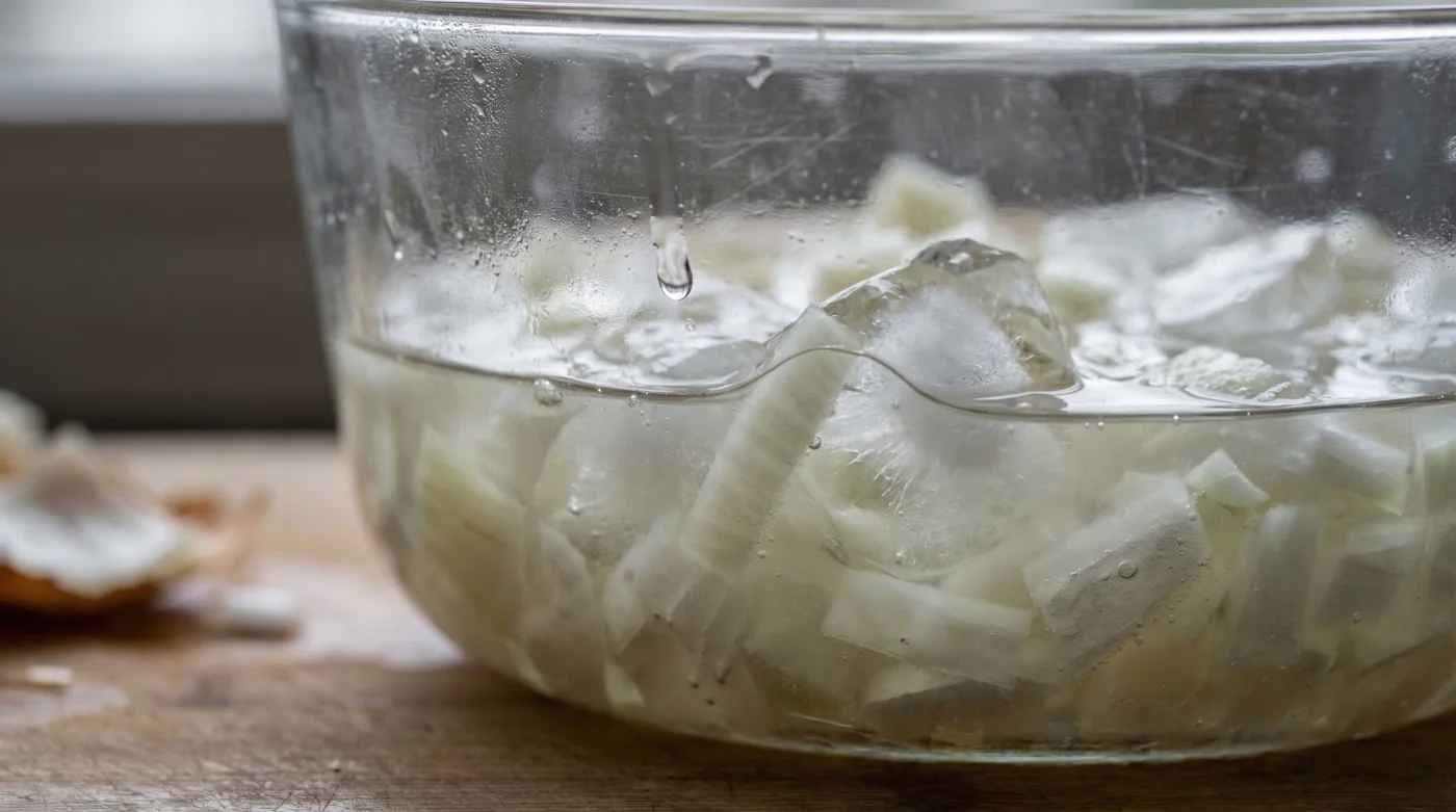 | A clear, odorless water bath upon completion. | Leaving the onions submerged for over 30 minutes (loss of all flavor). |